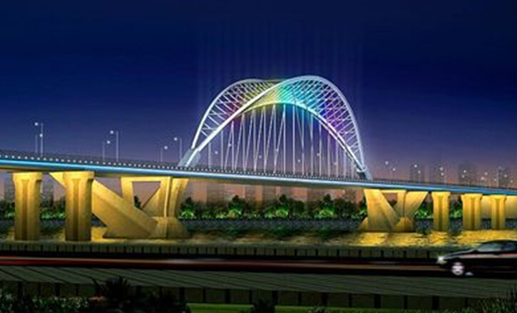 現(xiàn)代的大橋,多系現(xiàn)代化的鋼索斜拉橋,有雙塔斜拉、單塔斜拉。斜拉橋的外形特色在于拉索。大橋的照明將以重點突出這一特色為主,用不同的燈具及匠心獨具的藝術(shù)手法,一架碩大的豎琴屹立在大江、大河之上。為了烘托大橋的節(jié)目氣氛的整體效果,在橋上兩旁沿馬路,每4-5米可以放置1個藝術(shù)燈具,使之鏈成一條閃光的珍珠項鏈。對主塔的立面泛光照明可分三個方面:由下面上投時,要把整個主塔照得晶瑩透徹、潔白無瑕,雄偉壯觀這是大橋景觀的重中之重。為了使主塔全部都照亮,透視效果好,應(yīng)該還要在路面下設(shè)置平臺。用泛光燈由上向下照亮水面上部的塔基部分,使高塔的照明效果宛如一個巨人屹立在河水之上。