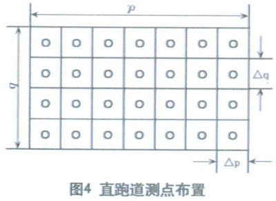 1) 四點(diǎn)法:把同一側(cè)兩燈柱間的測量路段分成若干個(gè)大小相等的矩形網(wǎng)格,把測點(diǎn)設(shè)置在每個(gè)矩形網(wǎng)格的四角,圖7為四點(diǎn)法布點(diǎn)時(shí)的測點(diǎn)布置圖。