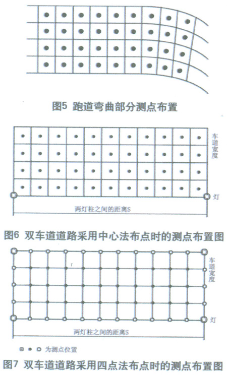 照度測量的范圍,在縱方向(沿道路走向)應(yīng)包括同一側(cè)的兩個(gè)燈桿之間的區(qū)域;而在橫方向,單側(cè)布燈時(shí)應(yīng)為整個(gè)路寬;雙側(cè)交錯(cuò)布燈、對稱布燈或中心布燈時(shí)可為1/2路寬。