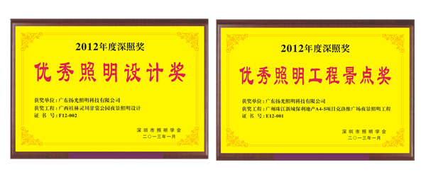 深照獎為獎勵深圳內外照明領域中,在科學研究、技術創新、成果推廣應用,實現高新技術產業化,照明工程實施和科普教育方面做出杰出貢獻的企事業單位和個人,是深圳市照明領域唯一的獎項,項目申報非常嚴格,評選條件苛刻,揚光照明設計的廣西桂林甘棠公園夜景照明和珠江新城保利地產A4-5項目克絡維廣場夜景照明工程分別獲獎。