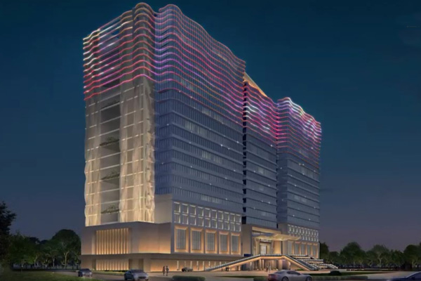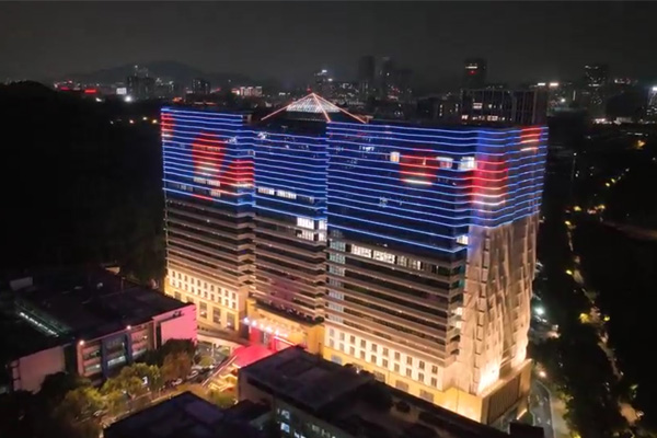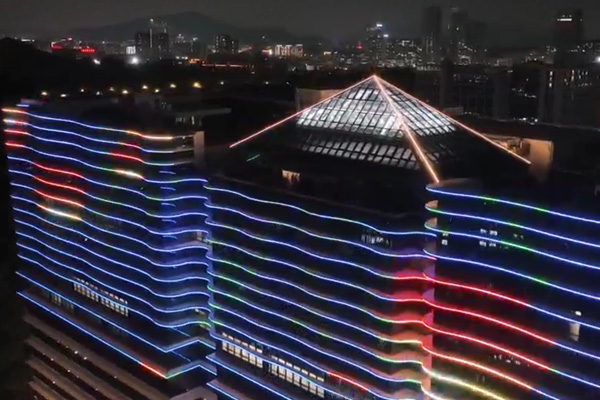 建筑頂部幕墻采用 RGBW 全彩燈光,通過智能控制,以立面動態圖案與定制動畫演繹企業形象,吸引多視角關注,深化企業品牌辨識度;控制系統設置平日、節假日模式,可根據不同節日定制專屬光影內容,并與廣場噴泉實現光影聯動,營造不同的場景氛圍。樓身則以大功率燈光做整體烘托,通過光影塑造建筑體量,強化空間視覺存在感。