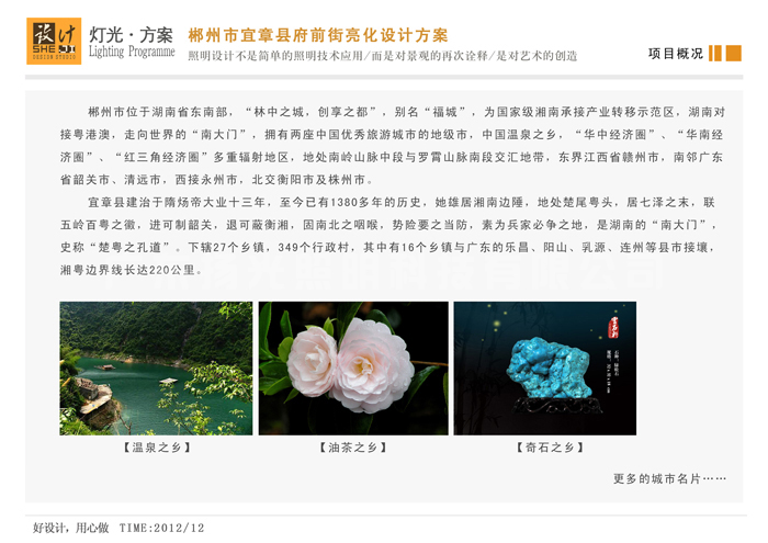 府前街位于郴州宜章縣,本次亮化工程設計施工具體指宜章府前街兩邊建筑照明設計,包括住宅建筑,商業建筑,行政建筑.....